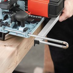 - Mit der neuen Grundplatte kann die Handkreissäge auch als Kappschienen-Säge verwendet werden. Dafür wird eine Führungseinrichtung benötigt.