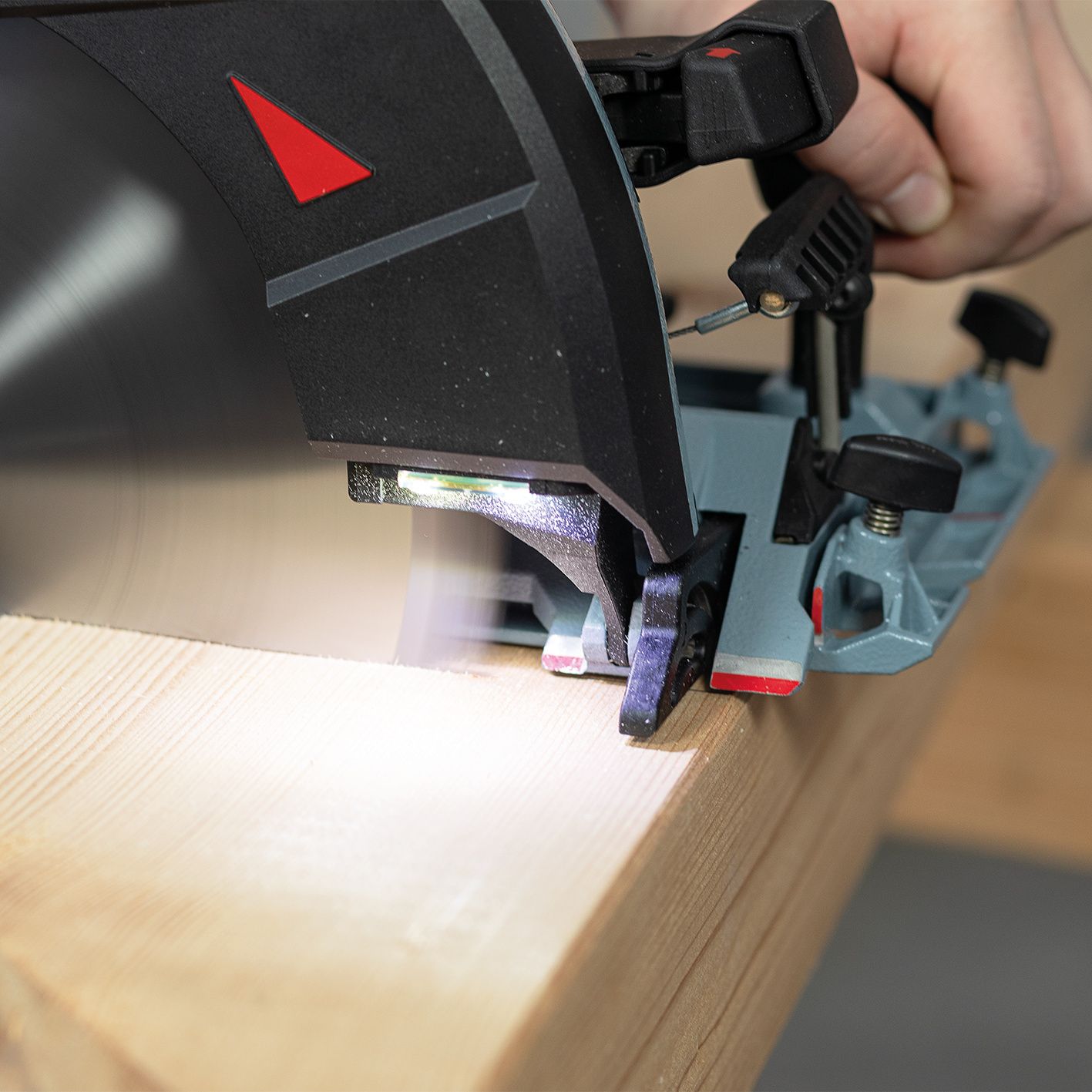 - Mit der neuen Grundplatte kann die Handkreissäge auch als Kappschienen-Säge verwendet werden. Dafür wird eine Führungseinrichtung benötigt.