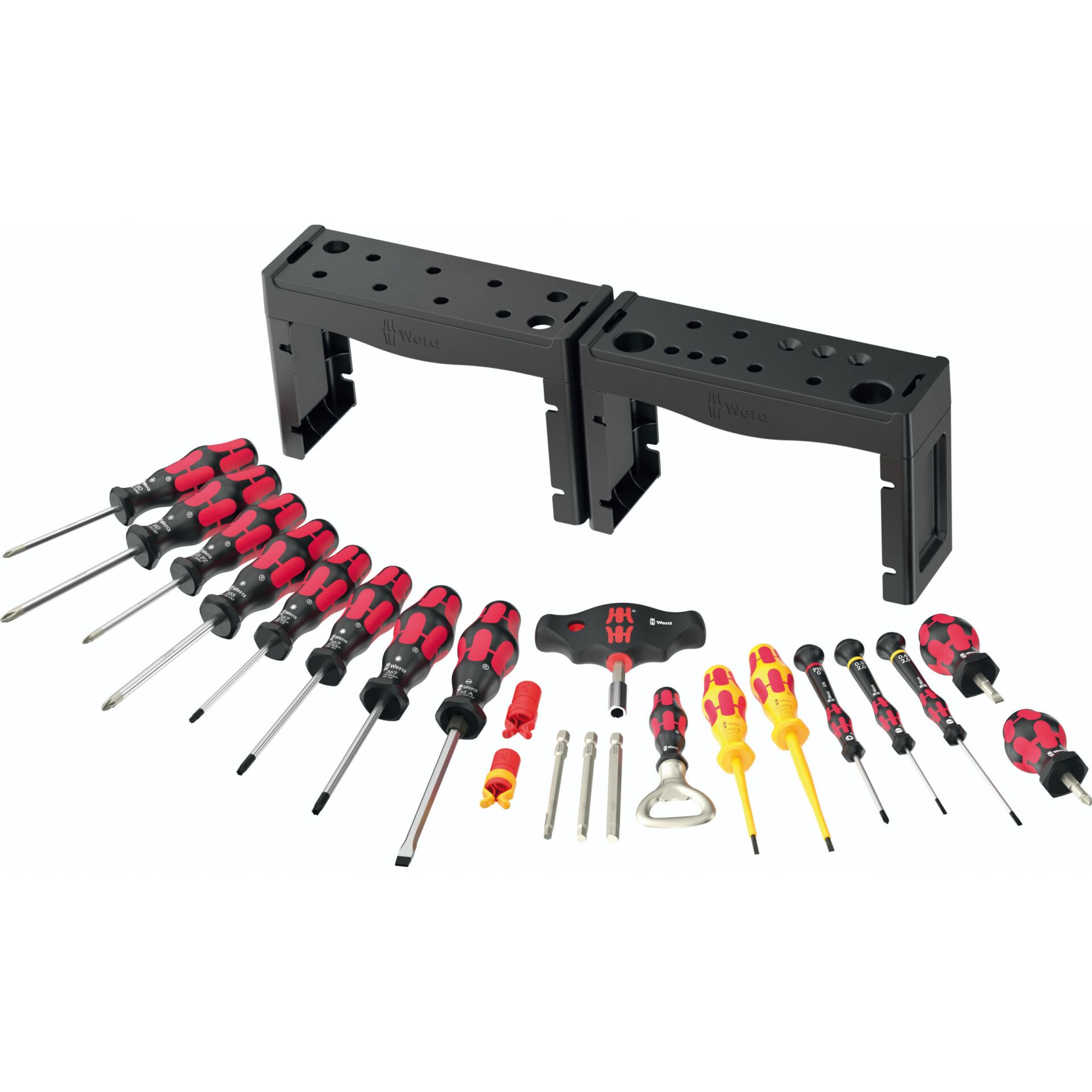 Der Wera Adventskalender beinhaltet 2025 eine umfassende Schraubwerkstatt für die gängigsten Schraubprofile und Anwendungen. Die beiden mitgelieferten Racks können aufgestellt oder an der Wand befestigt werden. Auf 28 Überraschungen darf sich der der Beschenkte/die Beschenkte freuen: 15 Schraubendreher, darunter 2 Schlitzwerkzeuge für VDE, 2 Stubbys, 3 Micro Werkzeuge für die Feinmechanik und einen Schraubmeißel mit Schlagkappe und durchgehender Klinge. 1 Bithalter mit Quergriff für ¼" Bits und 3 lange Bits (89 mm) runden den Inhalt ab. Der Quergriff liegt gut in der Hand und erlaubt die Übertragung hoher Drehmomente. Die beiden Schraubkrallen halten Schrauben sicher auf dem Werkzeug. Der Flaschenöffner ist ein Muss für alle Adventskalender Fans, auch 2025 im speziellen und nur im Kalender enthaltenen Design. 2 Racks sorgen für ordentliche Verstauung aller Werkzeuge (und des Flaschenöffners).